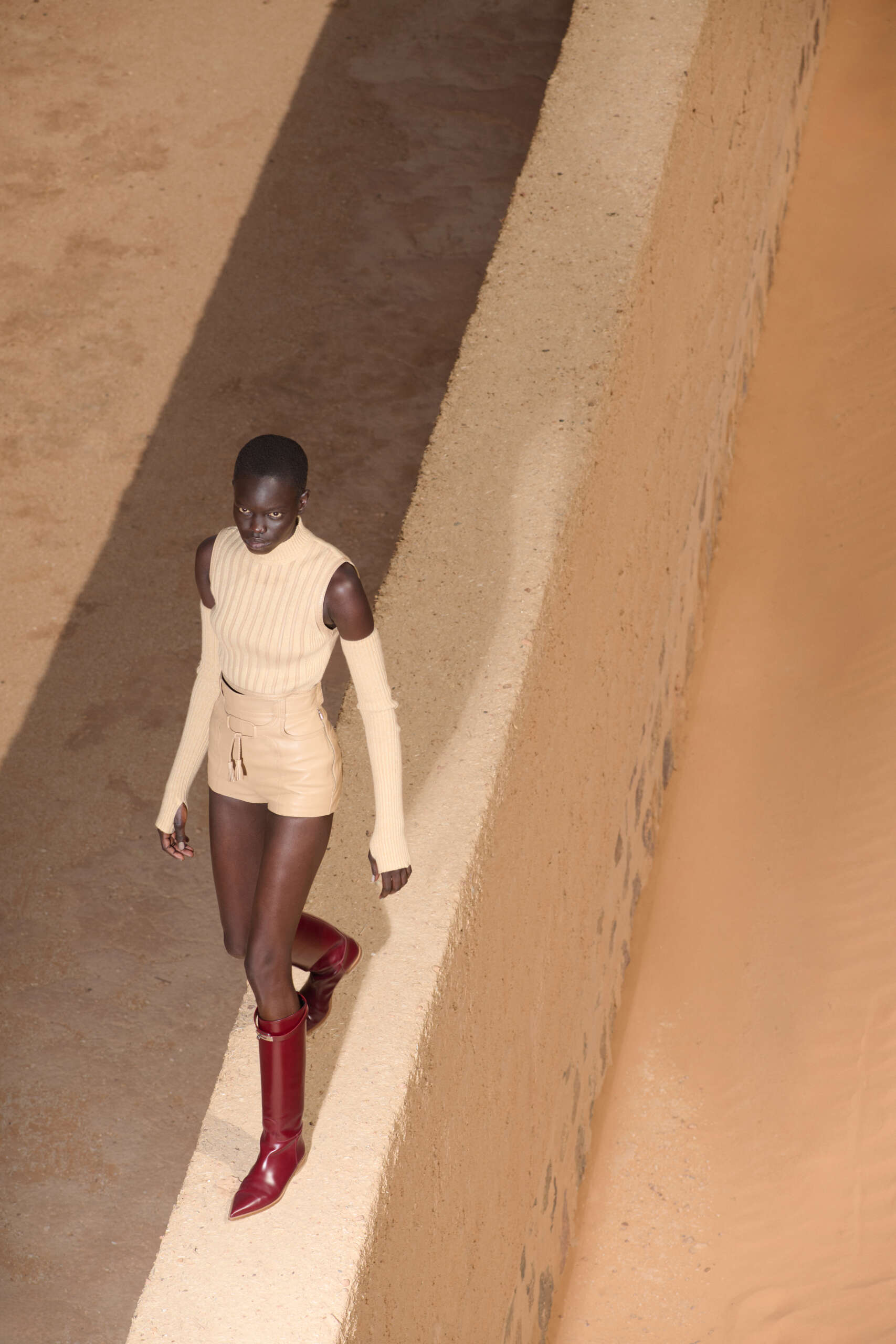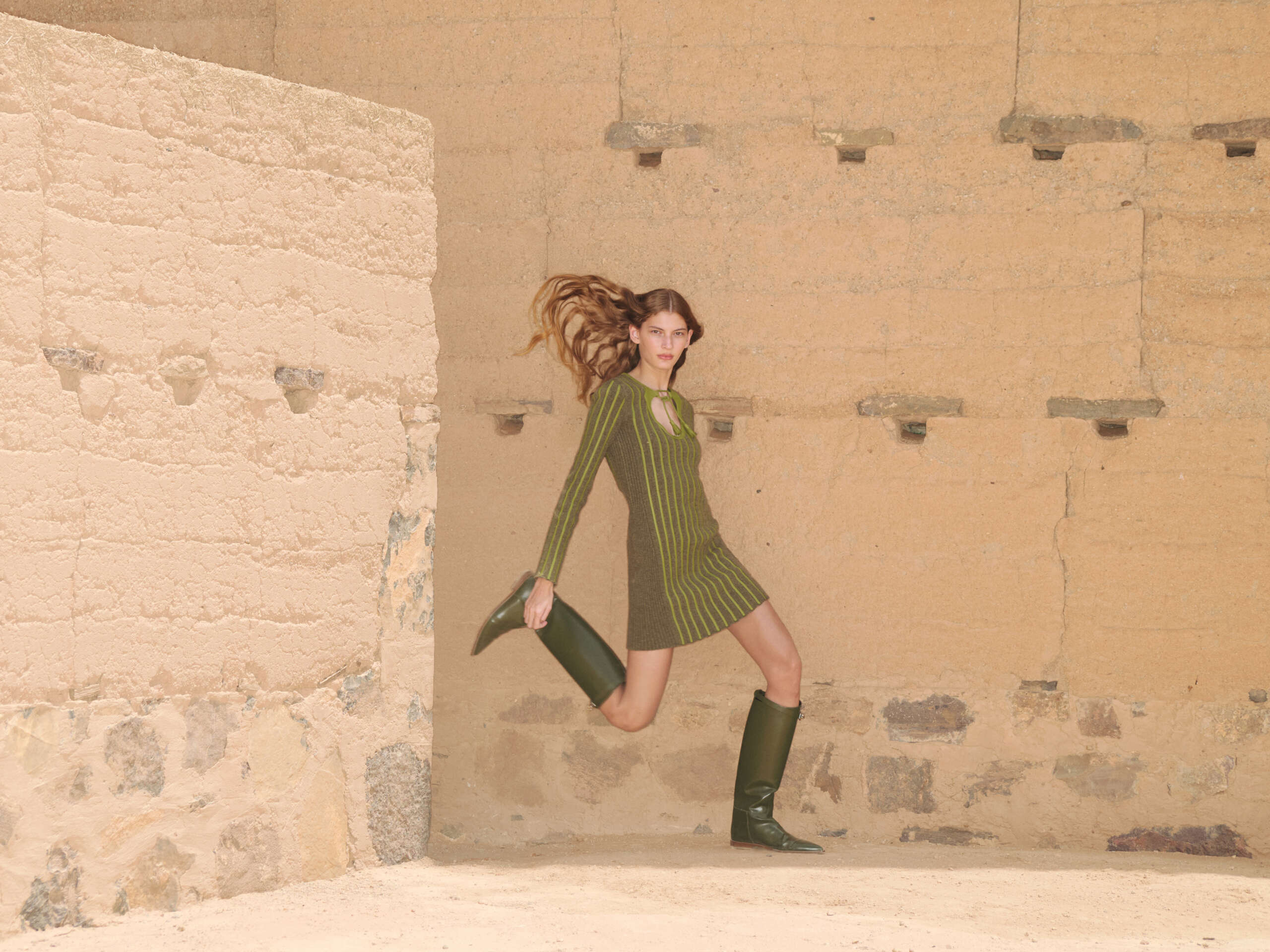 Pour Le Monde d’Hermès n°87, Johnny Dufort capture des instants fugaces, suspendus entre ciel et sable, où la mode rencontre l’architecture et où le mouvement devient sculpture.
